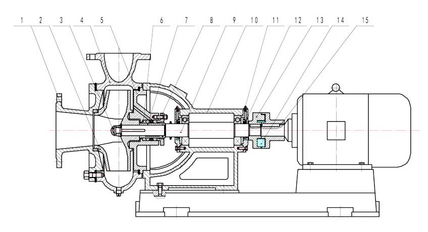1、前泵蓋2、葉輪3、葉輪螺母4、泵體5、后泵蓋6、填料7、軸套8、填料壓蓋9、軸10、托架11、壓注式油杯12、軸承蓋13、泵聯(lián)器14、彈性塊15、電聯(lián)器